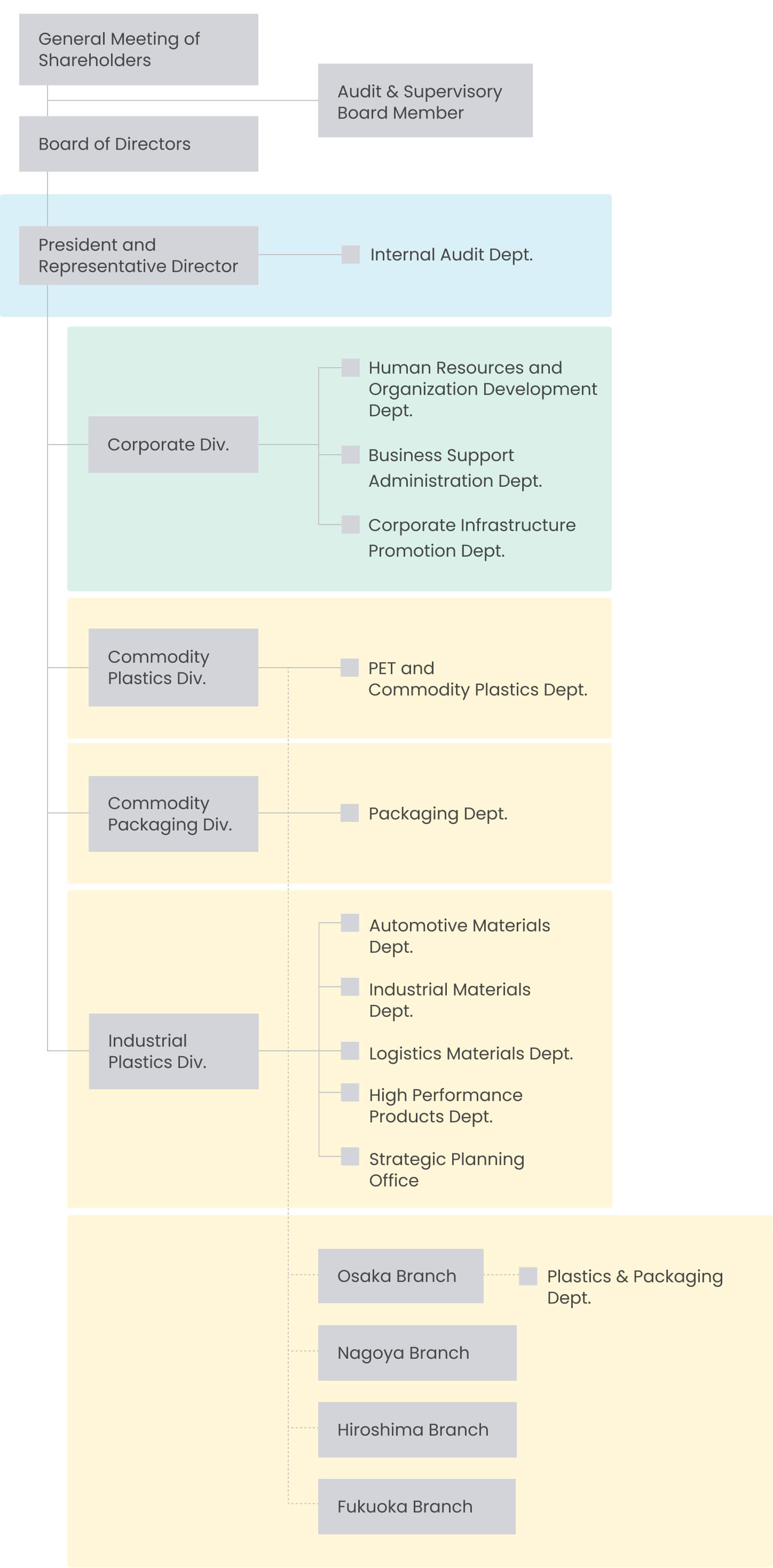 | Business | Domestic sales and import/export of synthetic resin materials, products and related products Sales, rental and management of logistics equipment and materials, including plastic pallets, containers and racks Supplies for convenience stores and other retailers, and domestic sales and import/export of commodity products Sales, rental and import/export of injection molding machines, packaging equipment and related parts Planning, development and sales of intellectual property rights, engineered systems and other software Information processing services |